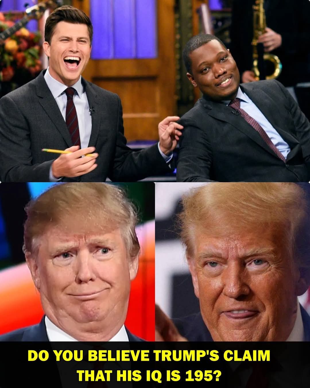 TRUMP’S “195 IQ” A JOKE? COLIN JOST AND MICHAEL CHE TEAM UP TO SET A MASTERFUL TRAP, MAKING TRUMP FREEZE WITH A FIRST-GRADER LEVEL QUESTION! 🔥 T.r.u.m.p was radiating confidence, bragging about his “off-the-charts genius IQ” while flashing that trademark smirk. The audience exchanged bewildered glances, unsure whether to laugh or gasp. Colin Jost and Michael Che didn’t cut in — they just watched, calm and patient, with that knowing look that always signals trouble. Then, right when T.r.u.m.p thought he owned the moment, Jost and Che leaned forward… paused… and delivered one single question so precise, so cutting, the entire room seemed to inhale at once. Instant silence.