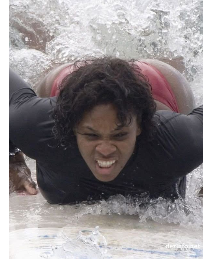 The wave crests. Serena pops up—graceful, powerful, all muscle memory from years of explosive movement. But the board betrays her. One wobble, a shift in weight, and suddenly she’s airborne. Not the elegant leap of a tennis serve, but the full-body commitment of someone who has no choice but to go down with the ship. And oh, does she go down.